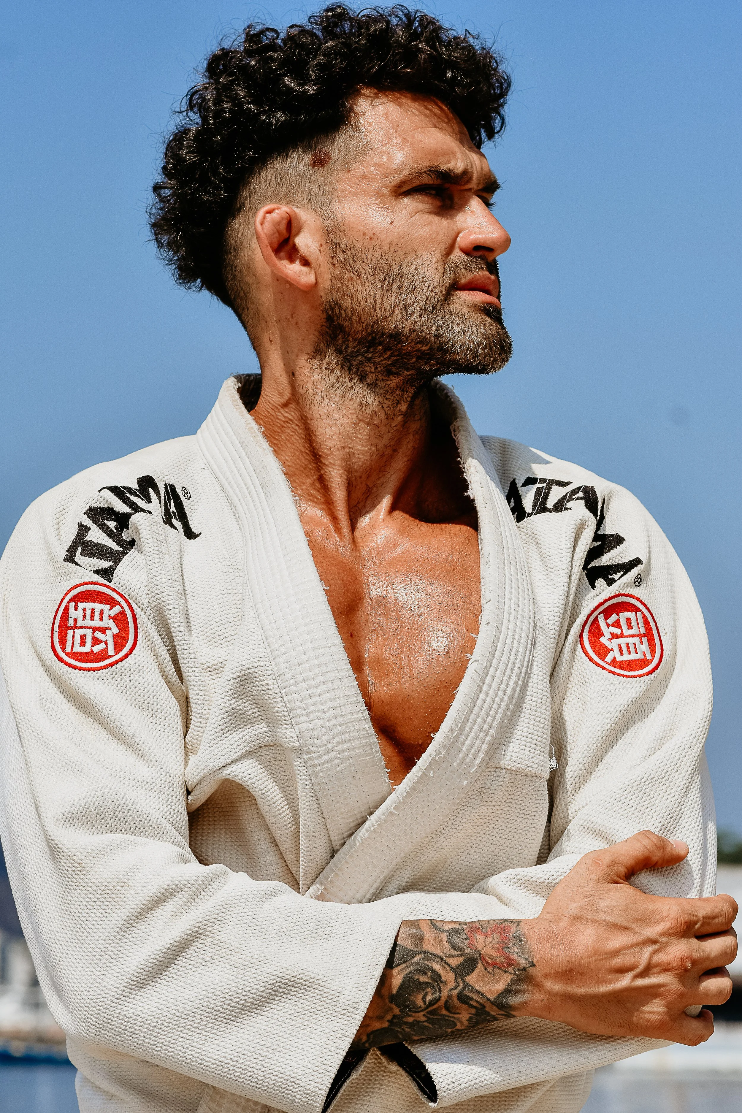 A man in a white jiu-jitsu gi with patches, showing a tattooed forearm, standing outdoors against a blue sky.