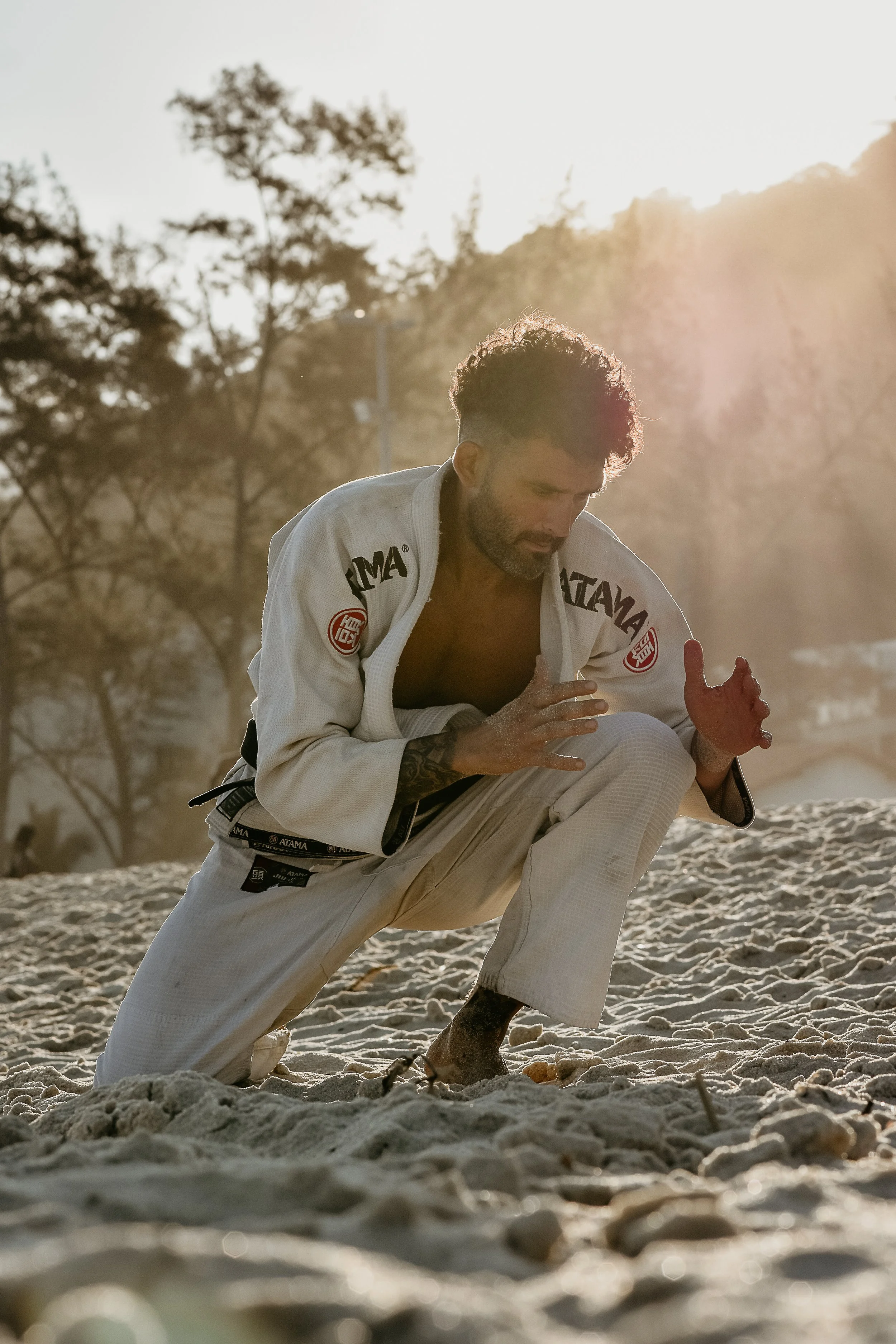 Black Belt Jiu Jitsu fighter at sunset in the sand